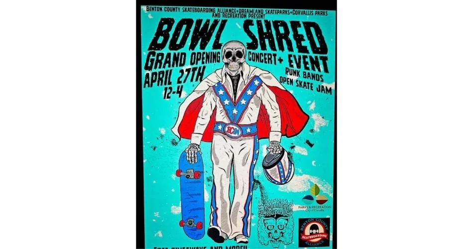 Bowl Shred Grand Opening! Thursday, April 24, 2025 12:00 PM 4:00 PM 12:00 16:00 Dreamland Skateparks LLC. 2150 SE HWY 101 PMB 384 LINCOLN CITY, OR 97367 United States (map) Google Calendar ICS Benton County Skateboarding Alliance + Dreamland Skateparks + Corvallis Parks & Recreation present Bowl Shred!Concert + EventPunks bandsOpen skate jam