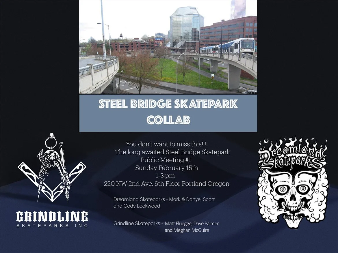 Don’t miss it! The long-awaited Steel Bridge Skatepark Public Meeting #1 is happening Sunday, February 15th, from 1–3 PM at 220 NW 2nd Ave., 6th Floor, Portland, OR.